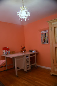 Here it is, the most important room in the house. Before, it had scary, dirty flocked wall paper, and carpet that used to be pink. This is a nice a bright room perfect for sewing, with a large closet for storage. We repurposed and cleaned the light from the entry, which doesn't really give off much light but looks cute. The cutting table is new, from Home Decorators, I like the size of it, but it has some drawbacks. The armoire was also my Aunt's, lucky for me she did some remodeling, and holds my yarn/fabric stash. The setup works really well for me and I am finishing projects faster in my new workspace.